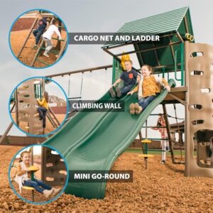 The Adventure Tower Deluxe Playset from Lifetime Products is full of exciting activities for children of all ages. Constructed of UV-protected high-density polyethylene (HDPE) and powder-coated steel, it’s durable, weather-resistant, and will not warp, rot, crack, or splinter. From the swing set and slide to the rock climbing walls, your kids will have no problem finding plenty of features to keep busy with. So let your kids enjoy the features and activities while you enjoy the low-maintenance and safety of a Lifetime Playset. Features 5′ tall decking with hard top clubhouse, sandbox, (2) doors, (4) storefronts, (2) rock climbing walls, (1) 9′ wavy slide, (1) steering wheel, (1) trapeze, (2) chalk boards, (1) arched climber, car map, (2) swings, monkey bars, and (1) fireman pole. This model comes in earth tone (green, brown, tan). Great for 3 to 12 year olds and can handle up to 10 players. 5-year limited warranty.