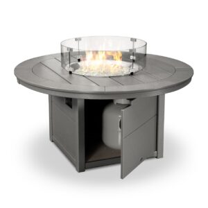- Includes fire table with leveling feet, 28″ linear stainless steel burner, burner lid, lava rock filler, storage cover, AAA battery, tank seat, touch up paint for mist gray and weathered slate finish, 9′ LP hose with regulator and natural gas conversion kit with 10′ NG hose and quick connect socket