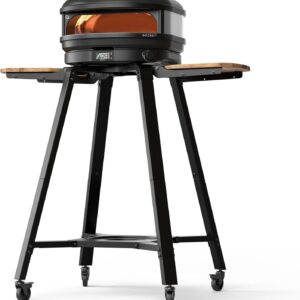- The included freestanding cart features LP tank storage, two shelves for easy prep, a door with magnetic latch, and airflow regulating vents