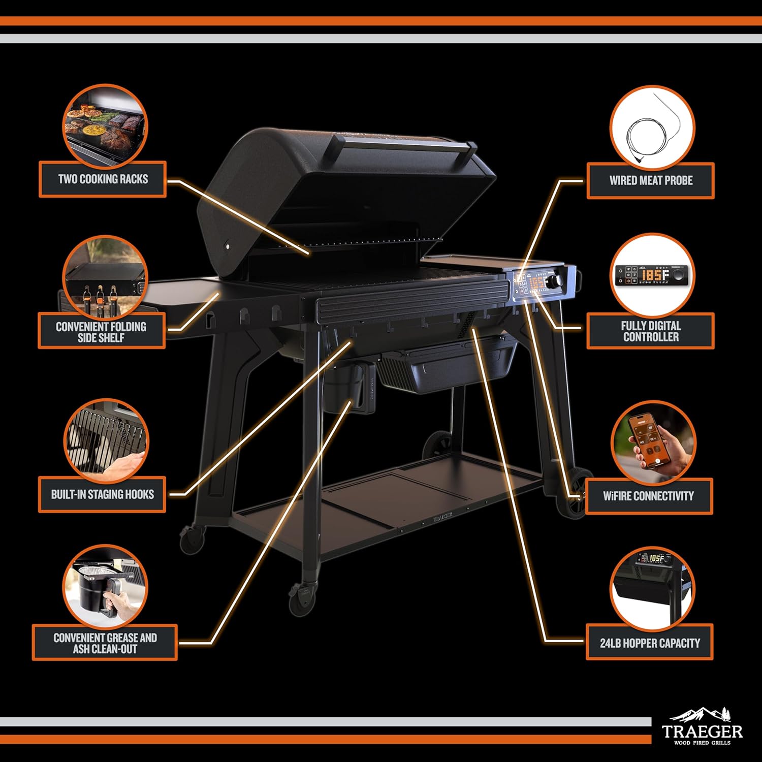 - Spacious Cooking Capacity: 970 sq. in. cooking area fits up to 7 chickens, 9 rib racks, or 7 pork butts, giving you the space to cook full meals on your Traeger smoker grill for family events, game day parties, and holiday celebrations.