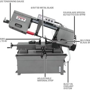 - Includes a blade-tension gauge, cast iron frame for vibration reduction and durability, ball bearing blade guides, thrust bearings, heavy-duty steel stand, a 4-inch dust port, a sturdy T-fence, a 93.5 by 3/8-inch blade, and an adjustable sliding miter gauge